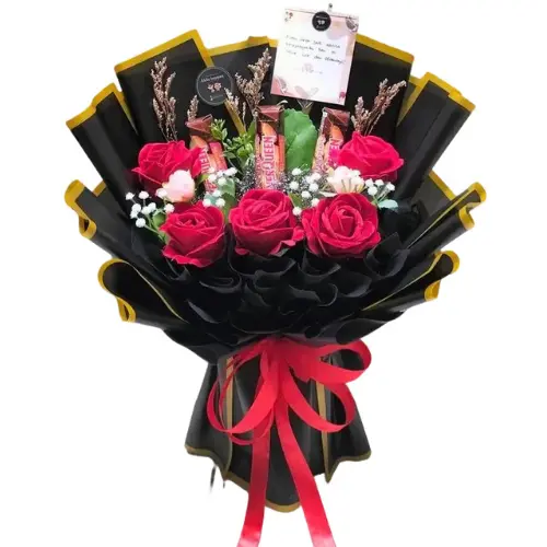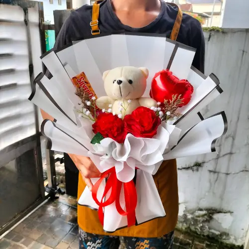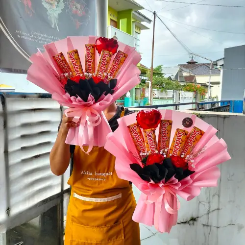 Buket valentine menurut pengalaman kami, pelanggan selalu memilih bunga mawar merah lalu dihiasi dengan coklat atau boneka. selain itu toko kami juga menyediakan coklat edisi hari valentine yang biasa kita gunakan yaitu coklat silverqueen untuk menghiasi buket.