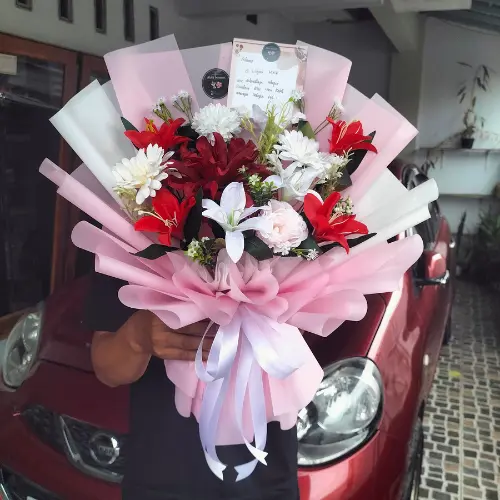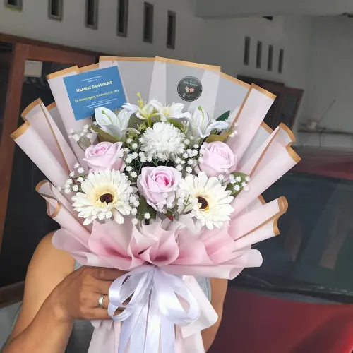 Dibungkus dengan kertas premium abu-abu list gold dan pita putih